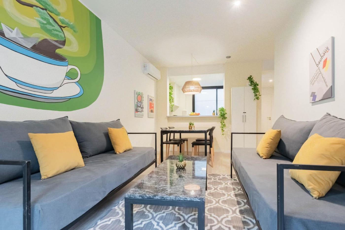 Este apartamento con aire acondicionado se compone de 1 dormitorio independiente, una sala de estar, una cocina totalmente equipada con nevera y microondas, y 1 baño. Hay toallas y ropa de cama en el apartamento.