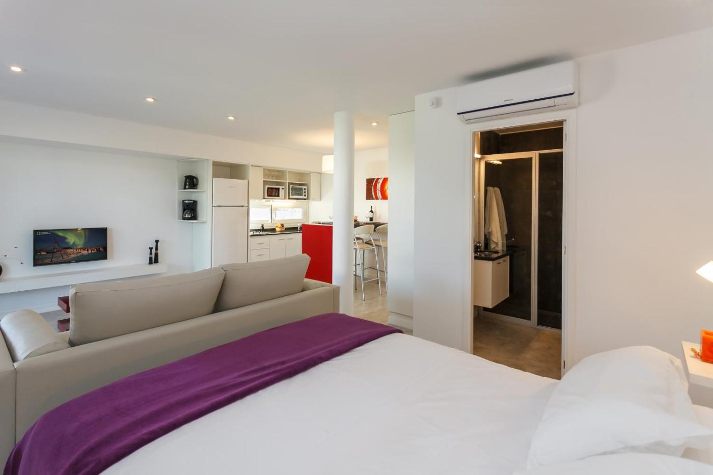 Estudio Deluxe con cama grande. This suite consists of 1 living room, 1 separate bedroom and 1 bathroom with a bath or a shower and free toiletries. Guests will find a refrigerator, kitchenware, an oven and a microwave in the fully equipped kitchen. The suite also offers a barbecue. Featuring a terrace with garden views, this suite also provides air conditioning and a flat-screen TV. The unit offers 2 beds. ;